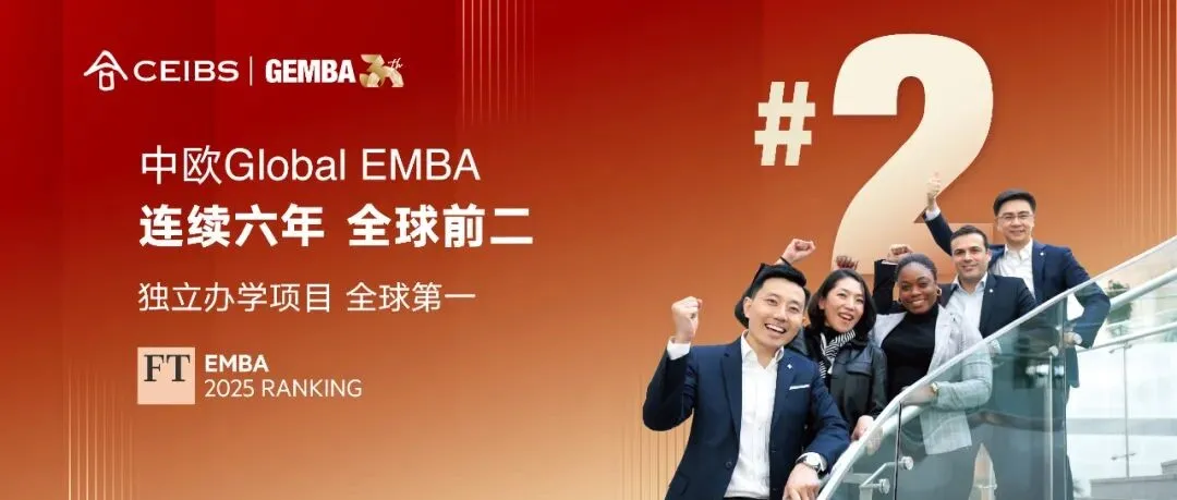 10月13日,英国《金融时报》(Financial Times,FT)正式公布2025年全球EMBA课程百强榜单,中欧国际工商学院(以下简称“中欧”)Global EMBA课程荣膺全球第二,这标志着课程连续六年稳居全球前二,连续四年跻身独立办学EMBA课程全球第一。与国内众多院校普遍采用合作课程模式不同,中欧以独立办学之姿实现了全球EMBA教育领域的持续领跑,彰显了中欧三十余年办学的深厚积淀和在国际管理教育舞台上的非凡实力。中欧Global EMBA自1995年开办,是中国内地首个英文EMBA课程。时值课程创设三十周年,这一佳绩再次凸显了其作为全球高管教育领军者与中国管理教育开拓者的地位。