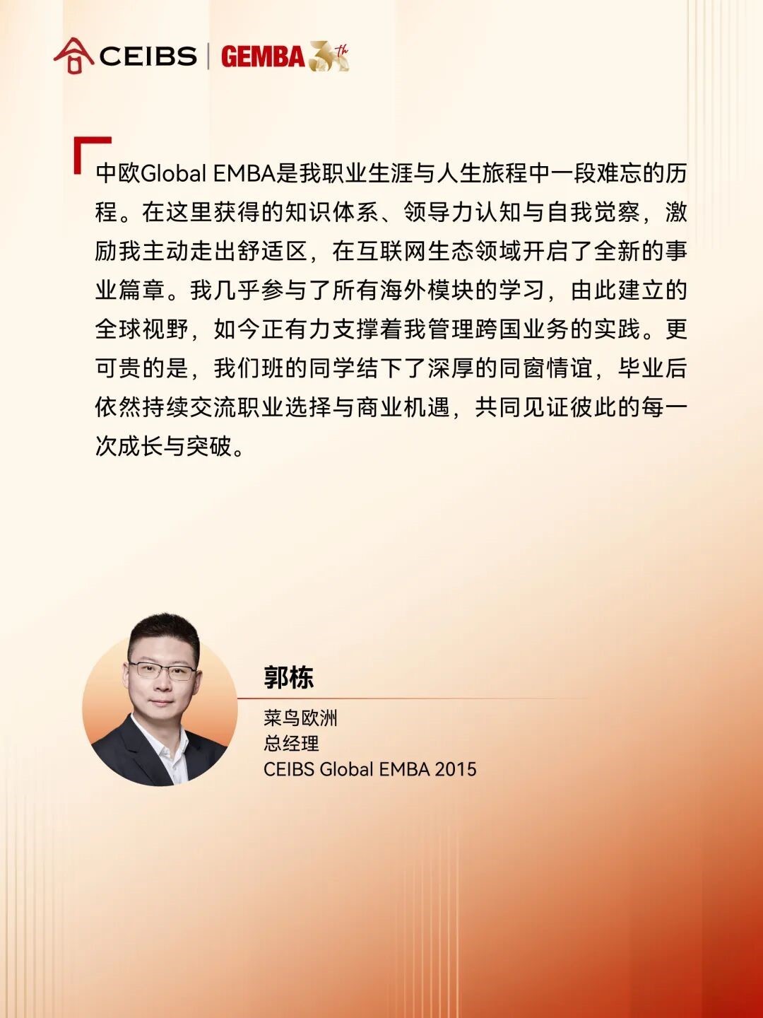 中欧国际工商学院副教务长、中欧Global EMBA课程主任芮博澜表示,“这不仅是一份荣誉,更是对我们持续践行使命的高度肯定。面对复杂多变的商业环境,中欧Global EMBA始终坚持系统融合学术前沿与商业实践,全面提升学生领导力,倡导可持续发展与负责任的管理理念。我们相信,未来的管理者不仅需具备领导力,更要兼具责任感、同理心和敏捷力,勇于直面前所未见的艰巨挑战,才能带领企业蓬勃发展。中欧Global EMBA将不断进取、开拓创新,培养更多能够引领未来、贡献社会的杰出领导者。”