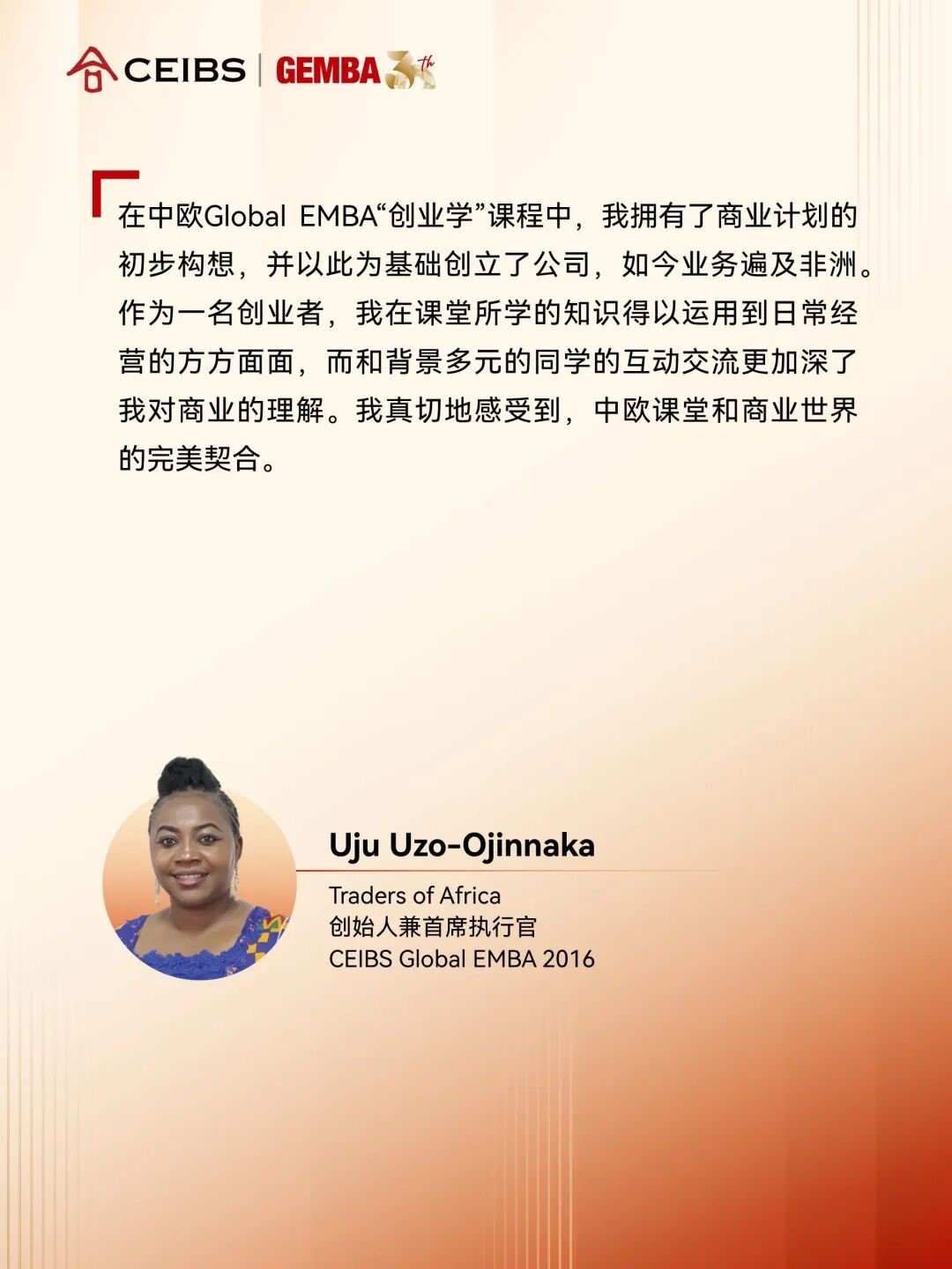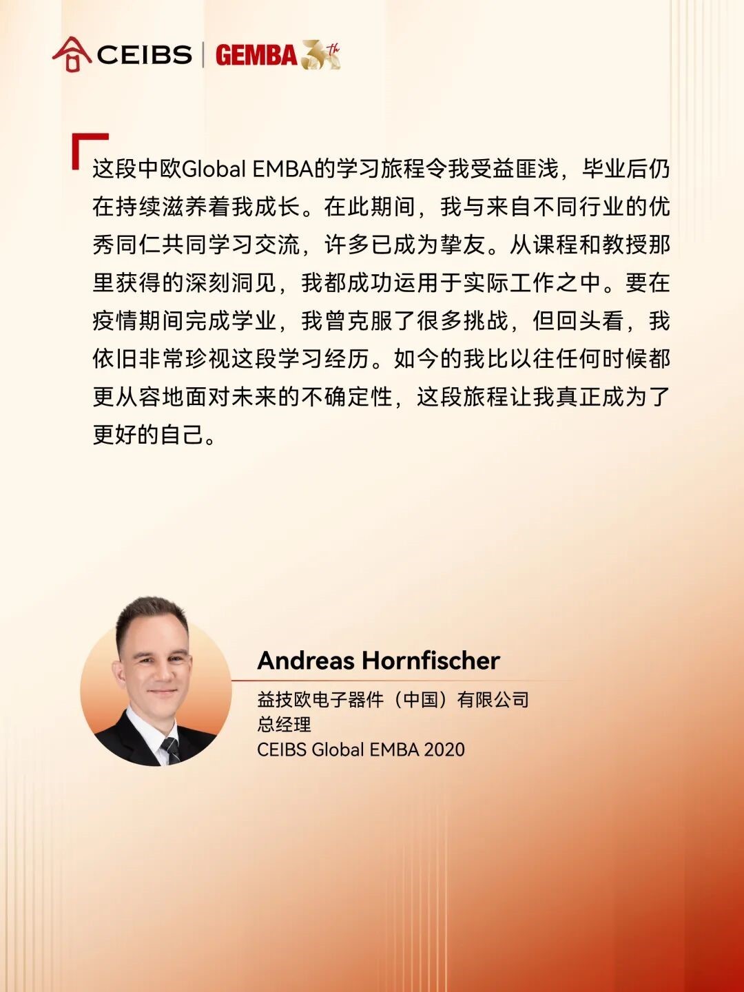 当前,经济格局持续动荡,商业环境瞬息万变,技术浪潮汹涌而来,对企业和企业家们带来了巨大冲击,也对管理知识的创造与创新提出了更高的期待和要求。中欧Global EMBA始终密切聚焦社会发展需求,紧跟全球趋势演变,以国际前沿教育理念为基础、中国本土商业实践为延伸,帮助学生系统学习商业认知和逻辑,全面提升战略思维和管理能力。通过全球化、多元化的学生构成和海外模块设置,以及贯穿始终的领导力培养,使企业和企业家们能够把握机遇、穿越周期,成为推动商业文明进步和经济社会繁荣的砥柱力量。