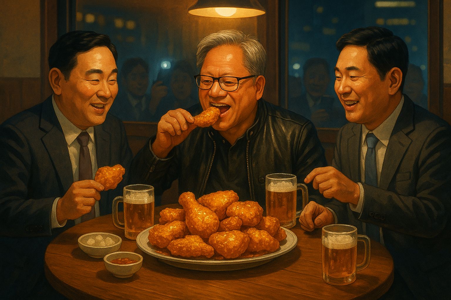 英伟达公司(Nvidia Corp.)首席执行官与三星电子(Samsung Electronics Co.)董事长李在镕(Jay Y Lee)、现代汽车(Hyundai Motor Co.)执行董事长郑义宣(Chung Euisun)在首尔本地餐厅Kkanbu Chicken一起喝啤酒、吃炸鸡的照片和视频在网络上走红,如今投资者正推高可能受益的相关股票。