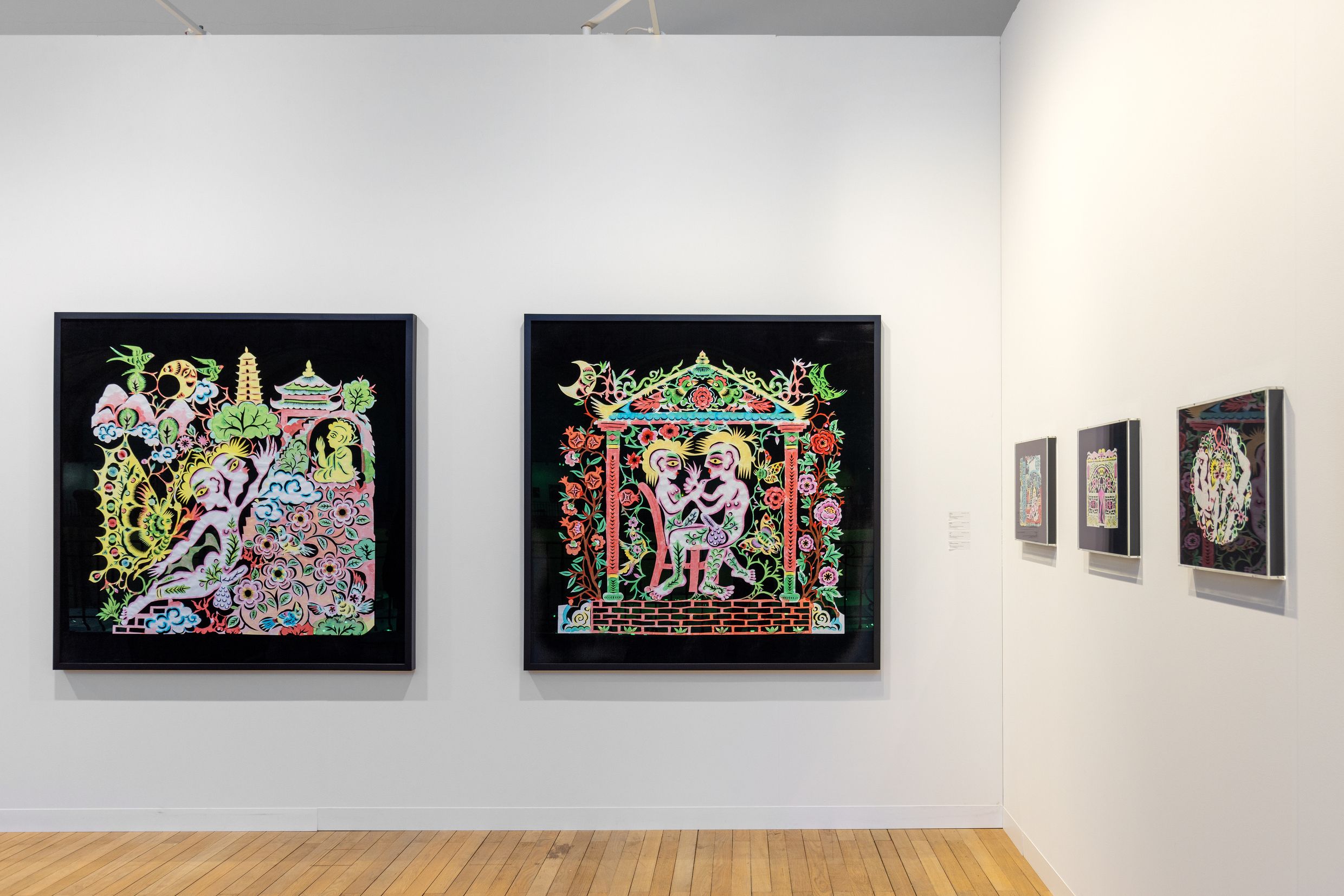 Xiyadie,Blindspot Gallery,Courtesy of Art Basel我还与来自香港,首次参加巴黎巴塞尔的Blindspot画廊总监秦美娜聊了聊。她带来了西亚蝶的剪纸作品,价格在6,000美元到32,000美元之间。西亚蝶出生于1963 年,最初在老家务农、结婚生子,过着传统的生活。在那些年里,他将从母亲那里习得的传统剪纸技艺当作一个避风港,用它来表达自己被压抑的同性情感。乍看之下,这些剪纸与传统民间艺术别无二致,然而细观其内容,却充满了极具挑衅的图像。这种将传统手工艺与现代身份议题相结合的创作方式,使得他的作品在去年威尼斯双年展上被发掘并立刻成为焦点。这恰好符合当前艺术市场对于物质性和叙事深度的关注。秦美娜高兴地报告,所有小幅作品都在“首选日”(First Choice Day)售罄,这为这位艺术家带来了极好的曝光。